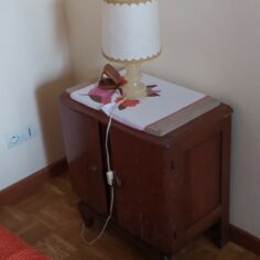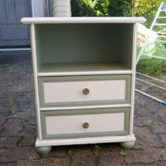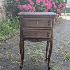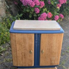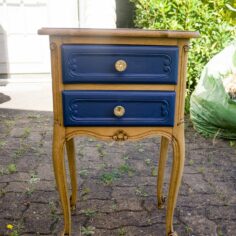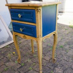 Tables de chevet, elles ont quasiment toutes subit le même traitement : Ponçage intégral, peinture sur certaines zones puis vernis intégral, les poignées ont été parfois remplacées. Les 2 bleues sont dans la même pièce. J’aime bien le fil directeur que le bleu indigo et le laiton donnent à ces meubles dépareillés.