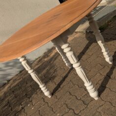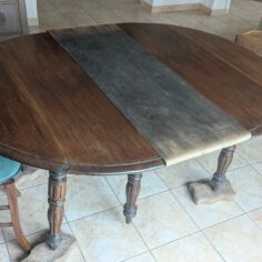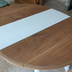 Table en noyer, ponçage intégral, traitement anti-tanin puis peinture des pieds. Le plateau est gardé brut, vernis. La rallonge, faite d’un autre bois, a été peinte en blanc. J’en ai profité pour rallonger les pieds car elle était un peu trop basse pour moi.