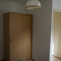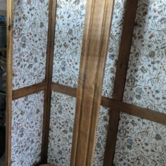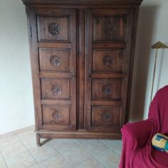 Armoire en chêne, amoureuse des portes je suis, pourtant que je ne les ai pas remises. Décirage avec un décapeur pour four, une brosse métallique et de la paille de fer. Ensuite, traitement au xylotruc, anti-tanin, vitrificateur mat (le seul que j’ai trouvé et qui ne modifie pas trop la couleur). A l’intérieur du papier peint et des étagères (avant il y avait un côté penderie, un côté étagère)