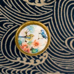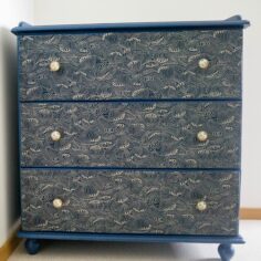 Commode en pin, je regrette de ne pas avoir de photo du avant. Elle était entière jaune ! Je l’ai décapé au décapeur thermique, j’ai plaqué les tiroirs pour faire disparaitre les moulures puis j’ai collé du tissu dessus, remplacé les poignées et peint le reste en bleu indigo. C’est ce qui donnera le point de départ de la décoration de la chambre !
