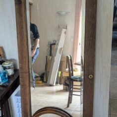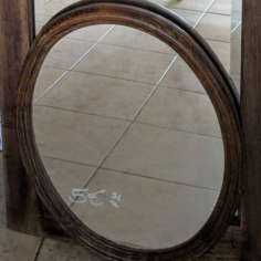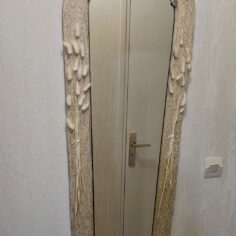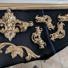 Un en mode rococoblingbling, une porte d’armoire en chêne trouvée à la recyclerie, le miroir a des facettes !! Une trouvaille inespérée. Le cadre a été retaillé puis poncé. Ensuite, j’ai collé des moulures trouvées dans un magasin de bricolage puis des pièces imprimées en PLA (merci les imprimantes de monsieur). Toutes les pièces ont été sous-couchées puis peintes en doré (peinture dorée chrome trouvé chez Action !). Le fait d’avoir sorti le miroir de son cadre sans trop faire attention l’a « piqué » ce qui lui donne un côté vieux (il n’avait pas l’air bien jeune ceci dit !) Ça faisait un bout de temps que je rêvais d’avoir un miroir dans ce genre sans y laisser un rein.