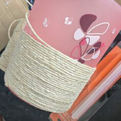 Un en corde, avec sa poubelle assortie. Le miroir a été fixé sur une fine planche. Puis j’ai fait le tour encore et encore et encore et encore en collant ma corde à la colle chaude. Pas très inspirée pour celui là mais la forme s’y prêtait et j’avais un rouleau de corde. Puis je me suis attaquée à la poubelle qui faisait un peu tache!