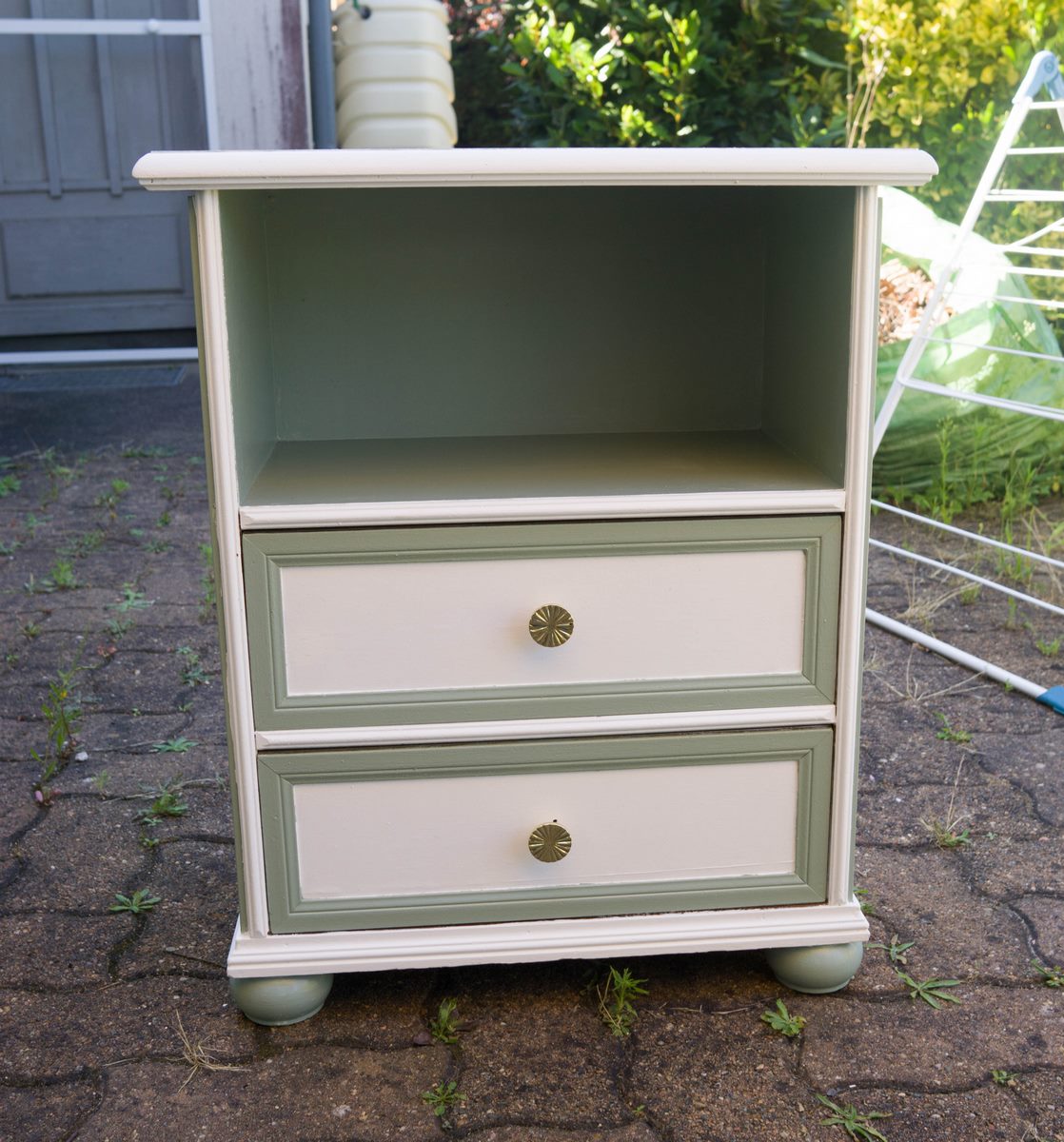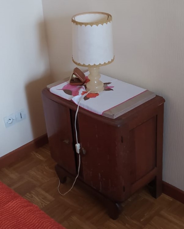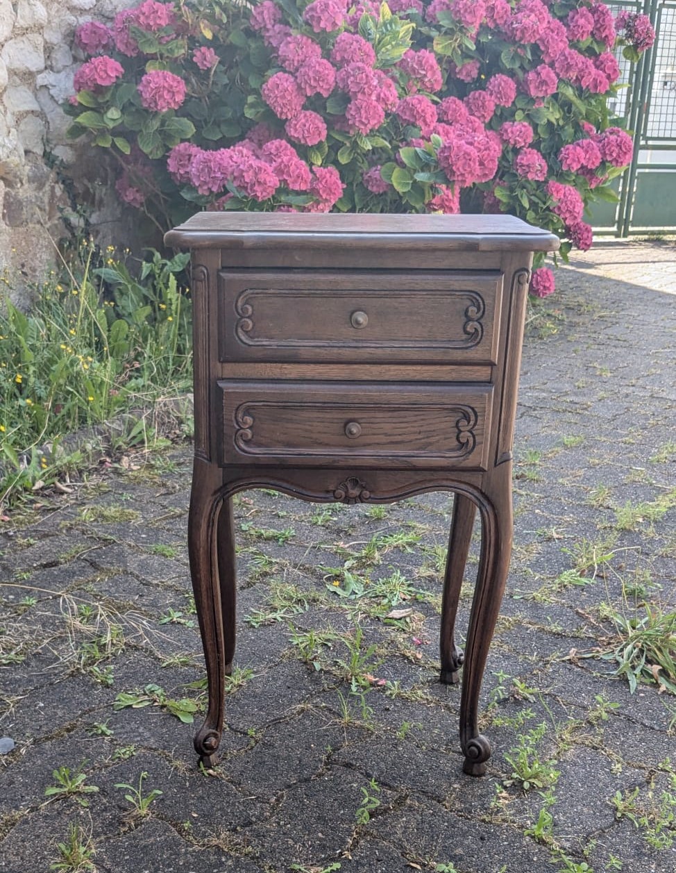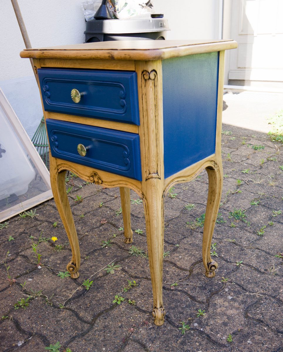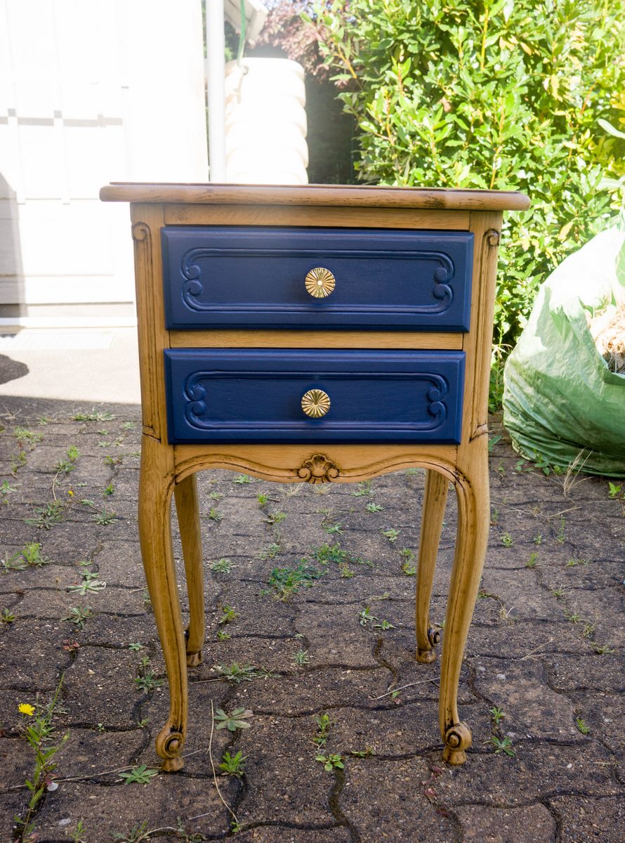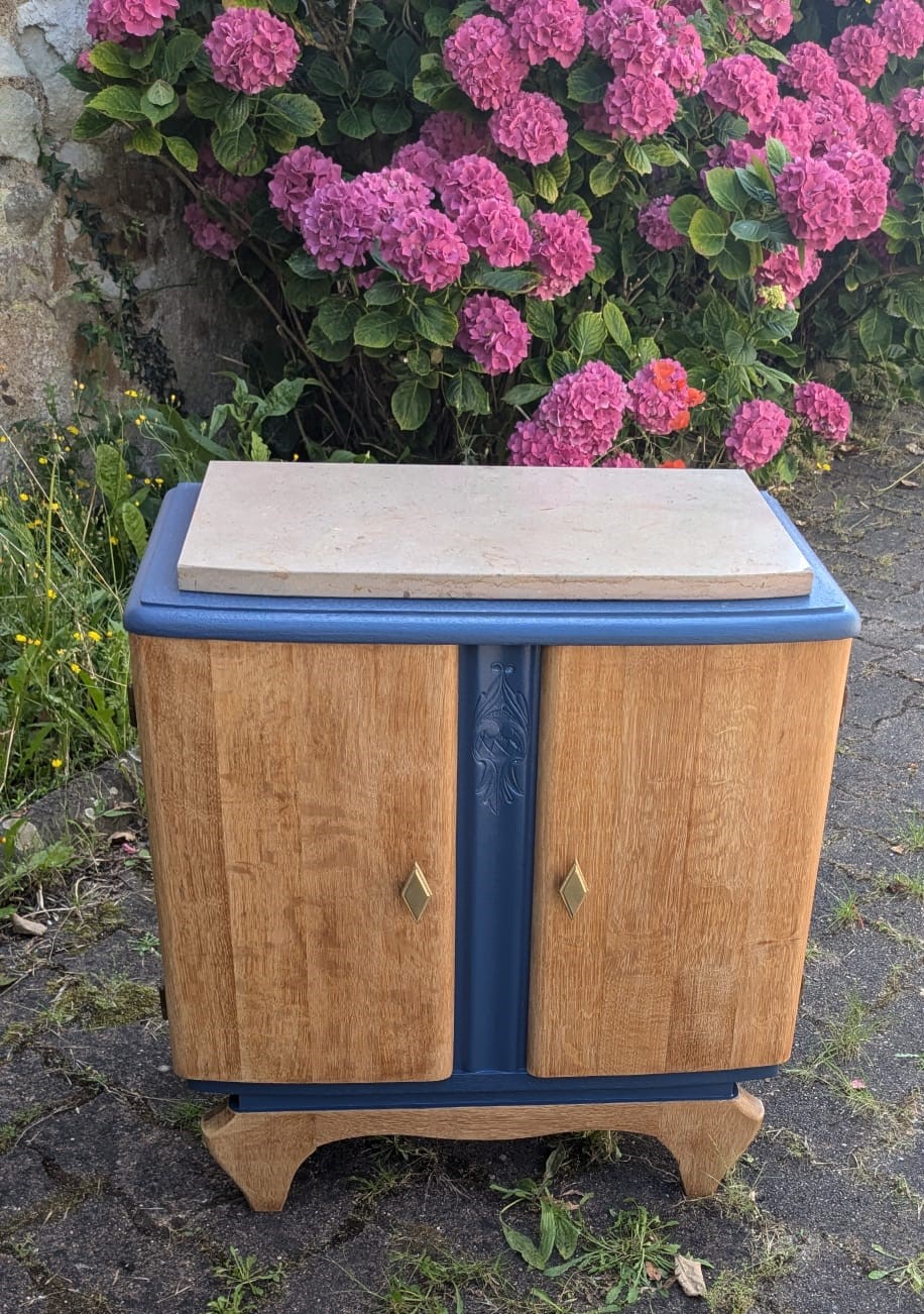 Tables de chevet, elles ont quasiment toutes subit le même traitement : Ponçage intégral, peinture sur certaines zones puis vernis intégral, les poignées ont été parfois remplacées. Les 2 bleues sont dans la même pièce. J’aime bien le fil directeur que le bleu indigo et le laiton donnent à ces meubles dépareillés.