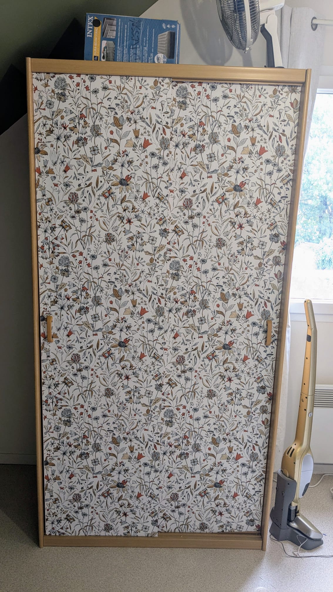 Armoire en toc, la customisation la plus simple du monde : J’ai collé du papier peint sur les portes ! Je voulais qu’elle doit visuellement moins « mastoc »