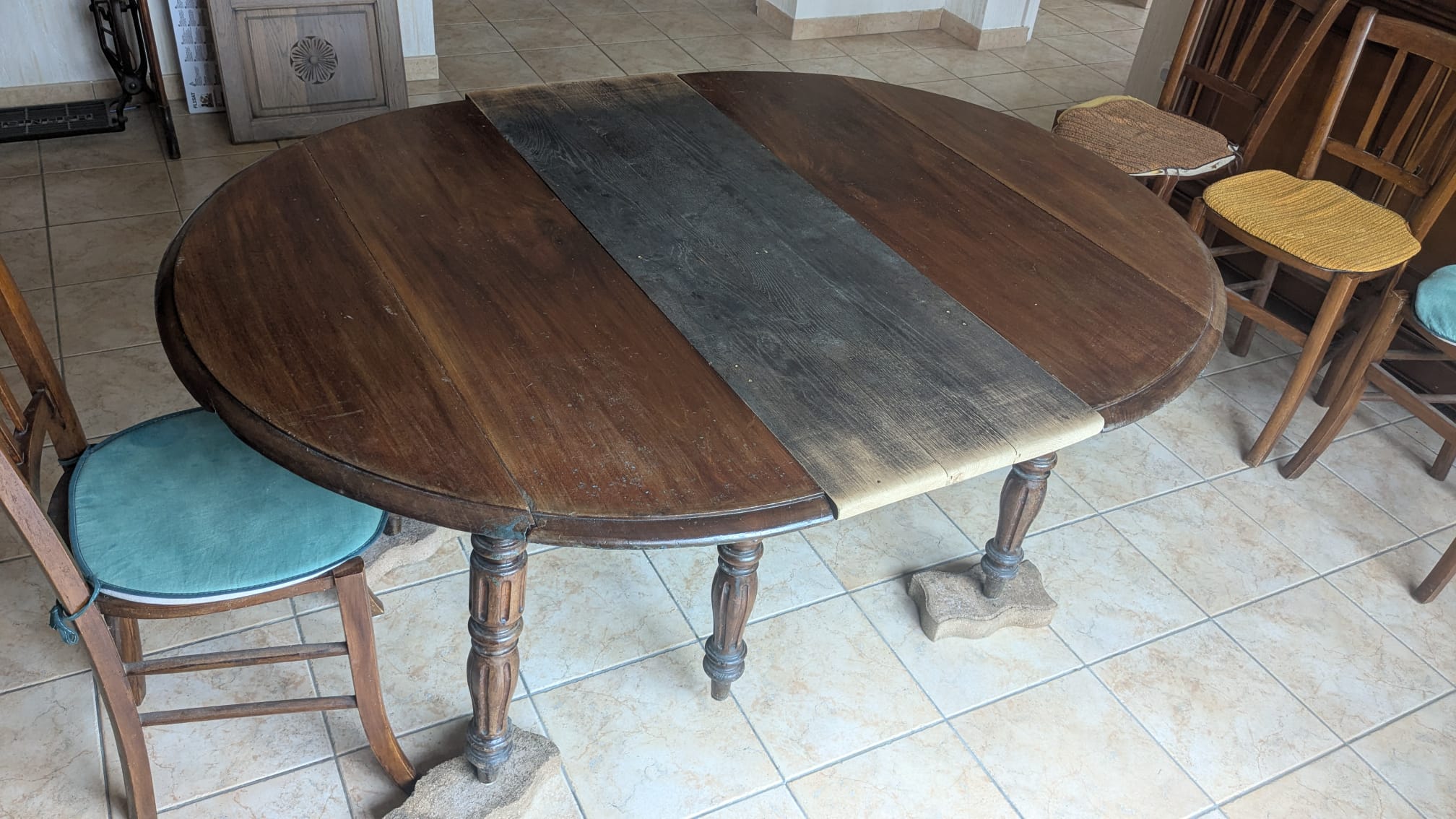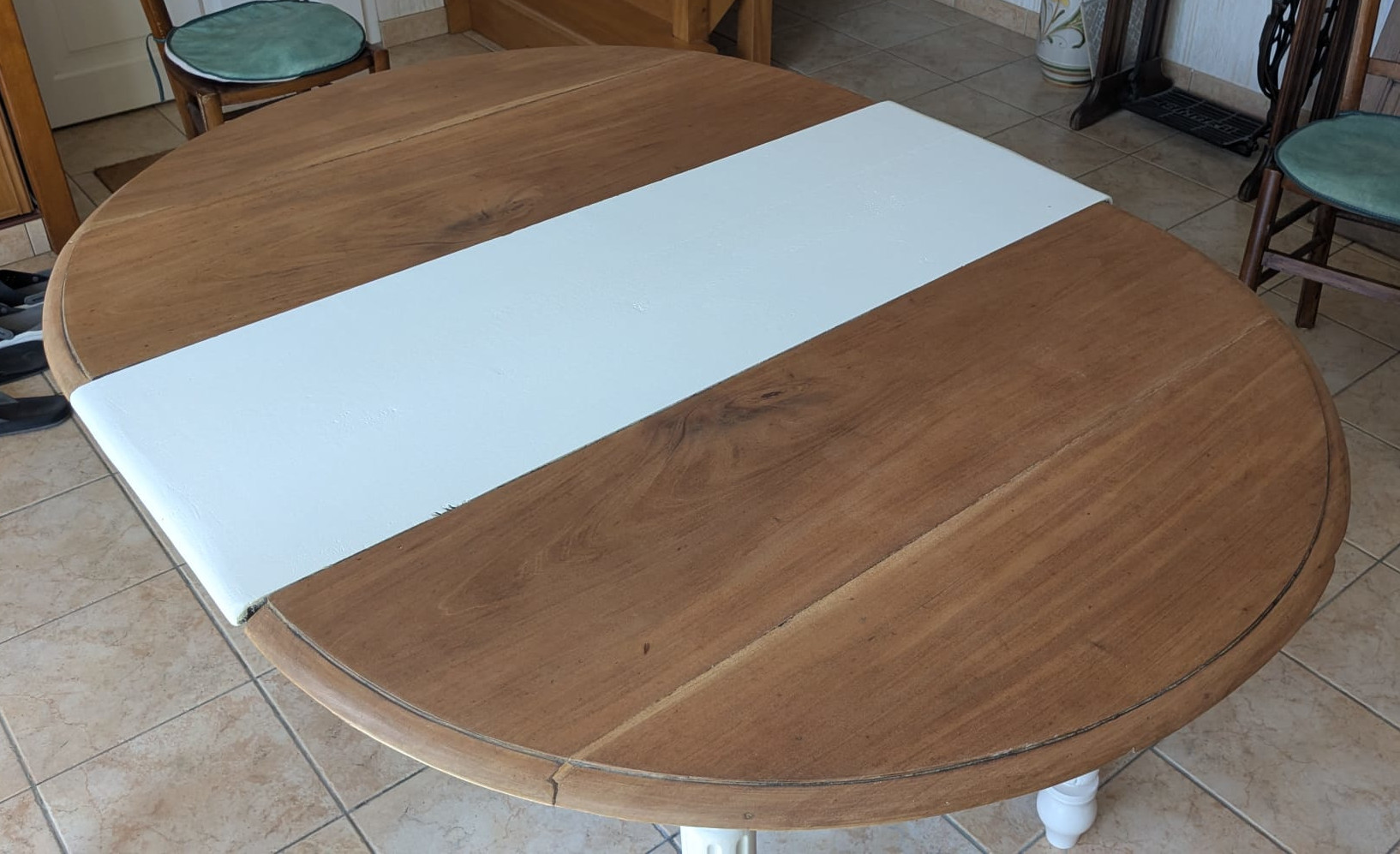 Table en noyer, ponçage intégral, traitement anti-tanin puis peinture des pieds. Le plateau est gardé brut, vernis. La rallonge, faite d’un autre bois, a été peinte en blanc. J’en ai profité pour rallonger les pieds car elle était un peu trop basse pour moi.