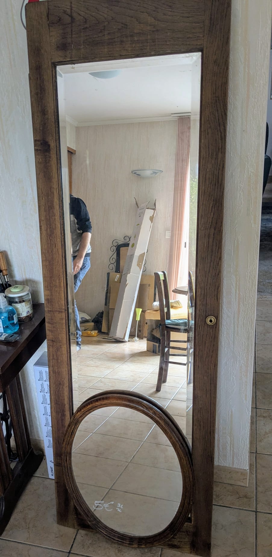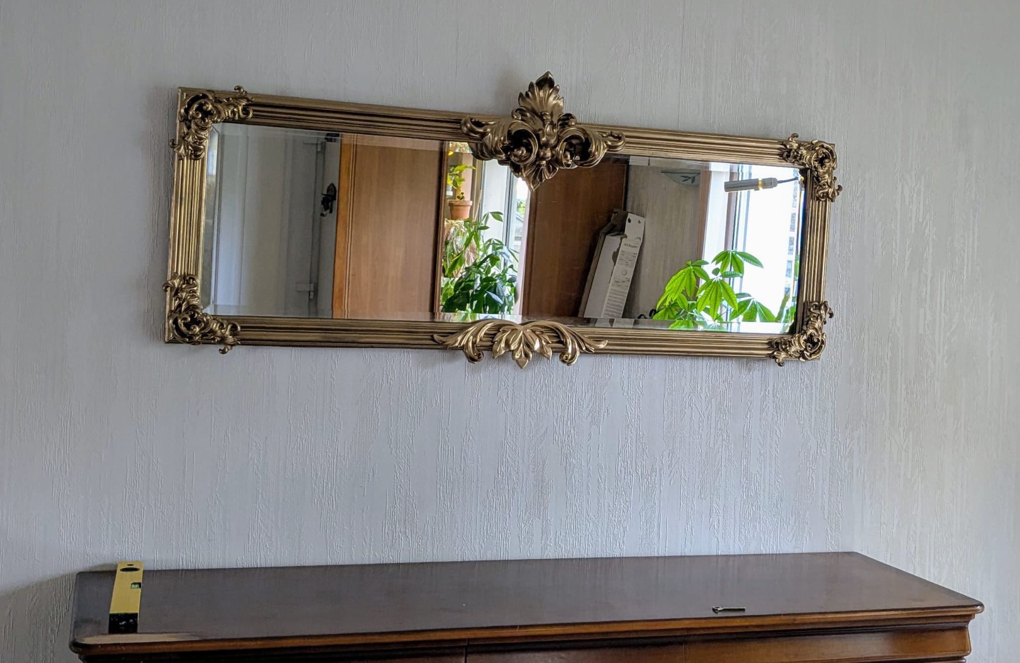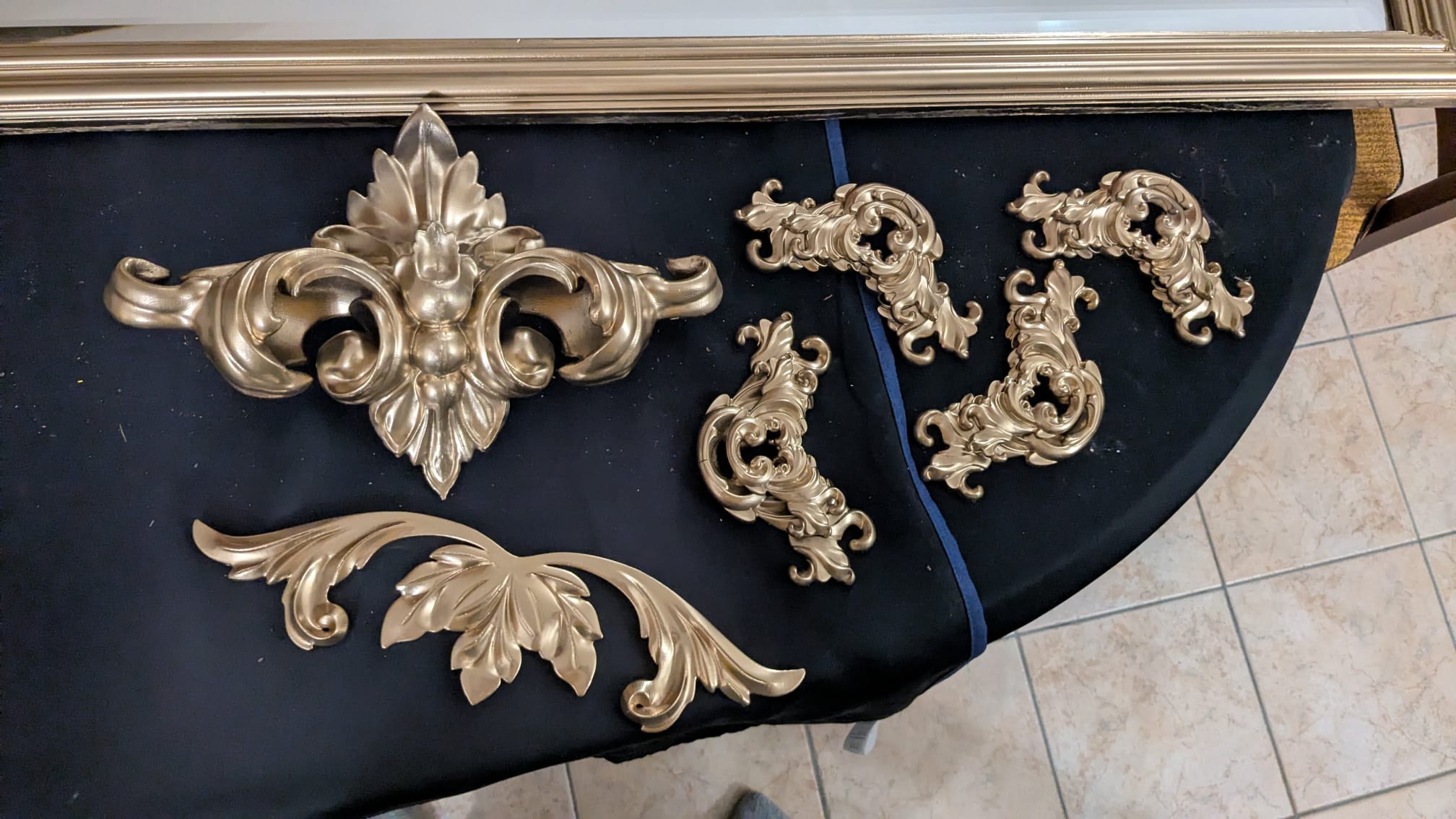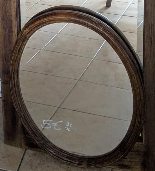 Un en mode rococoblingbling, une porte d’armoire en chêne trouvée à la recyclerie, le miroir a des facettes !! Une trouvaille inespérée. Le cadre a été retaillé puis poncé. Ensuite, j’ai collé des moulures trouvées dans un magasin de bricolage puis des pièces imprimées en PLA (merci les imprimantes de monsieur). Toutes les pièces ont été sous-couchées puis peintes en doré (peinture dorée chrome trouvé chez Action !). Le fait d’avoir sorti le miroir de son cadre sans trop faire attention l’a « piqué » ce qui lui donne un côté vieux (il n’avait pas l’air bien jeune ceci dit !) Ça faisait un bout de temps que je rêvais d’avoir un miroir dans ce genre sans y laisser un rein.
