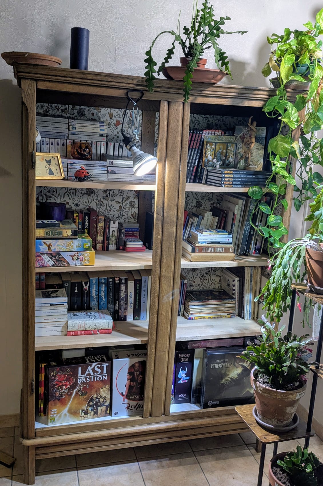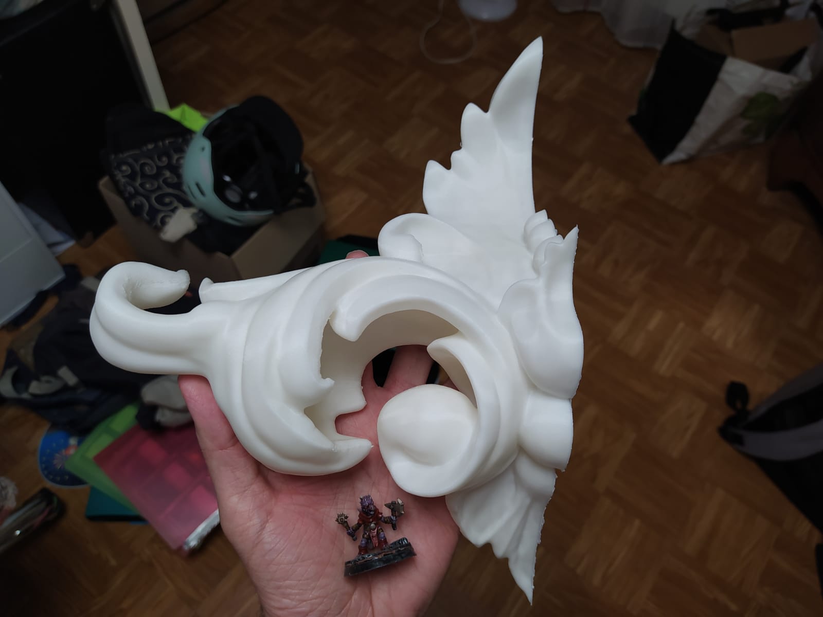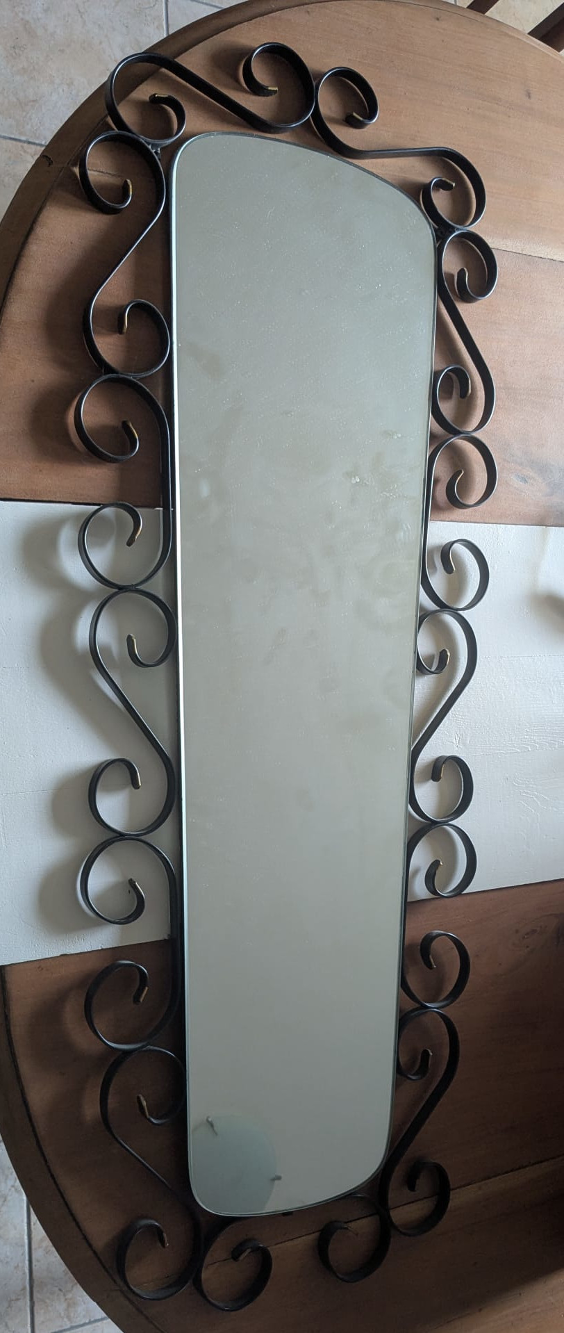 Un en mode rococoblingbling, une porte d’armoire en chêne trouvée à la recyclerie, le miroir a des facettes !! Une trouvaille inespérée. Le cadre a été retaillé puis poncé. Ensuite, j’ai collé des moulures trouvées dans un magasin de bricolage puis des pièces imprimées en PLA (merci les imprimantes de monsieur). Toutes les pièces ont été sous-couchées puis peintes en doré (peinture dorée chrome trouvé chez Action !). Le fait d’avoir sorti le miroir de son cadre sans trop faire attention l’a « piqué » ce qui lui donne un côté vieux (il n’avait pas l’air bien jeune ceci dit !) Ça faisait un bout de temps que je rêvais d’avoir un miroir dans ce genre sans y laisser un rein.