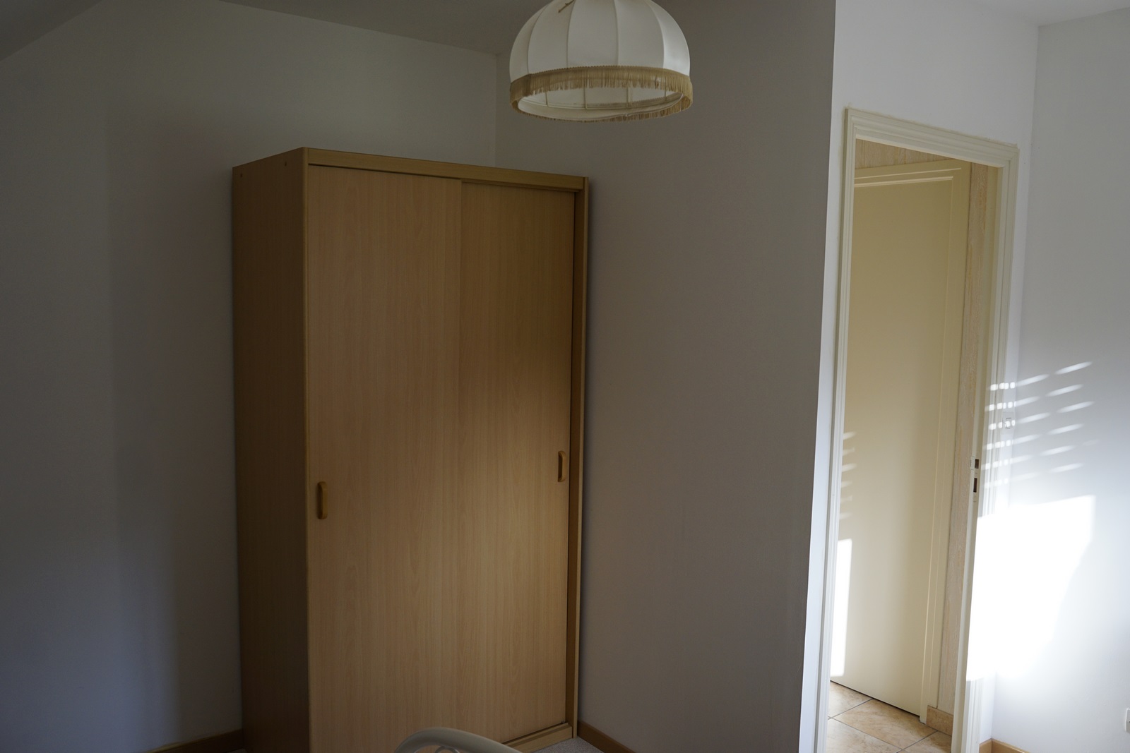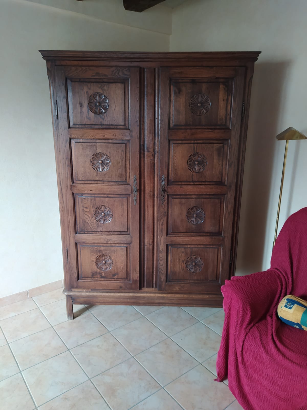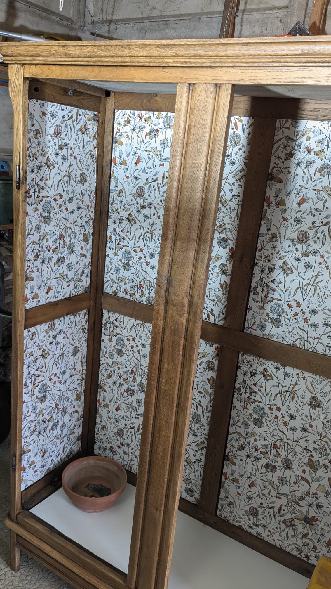 Armoire en chêne, amoureuse des portes je suis, pourtant que je ne les ai pas remises. Décirage avec un décapeur pour four, une brosse métallique et de la paille de fer. Ensuite, traitement au xylotruc, anti-tanin, vitrificateur mat (le seul que j’ai trouvé et qui ne modifie pas trop la couleur). A l’intérieur du papier peint et des étagères (avant il y avait un côté penderie, un côté étagère)