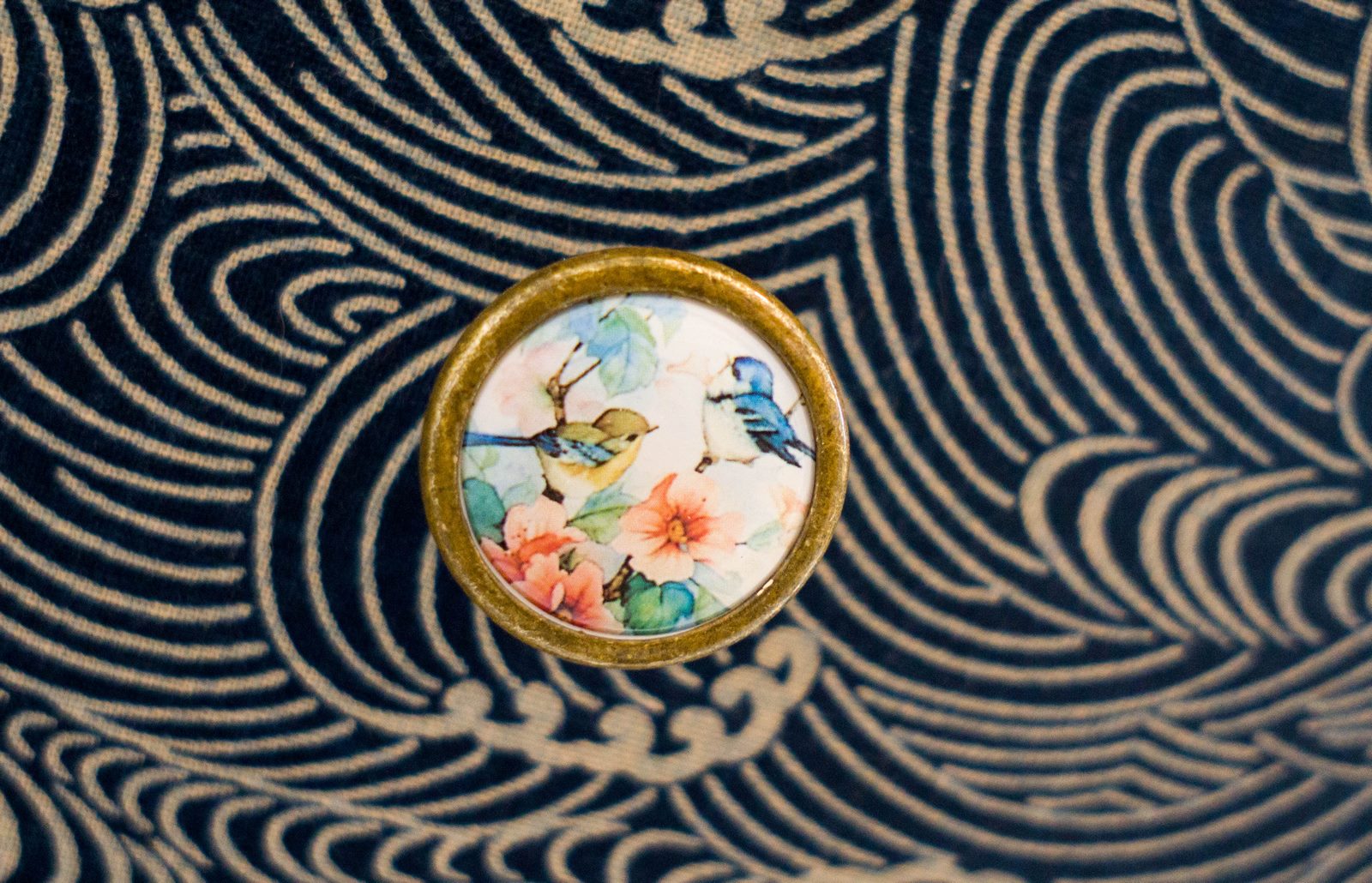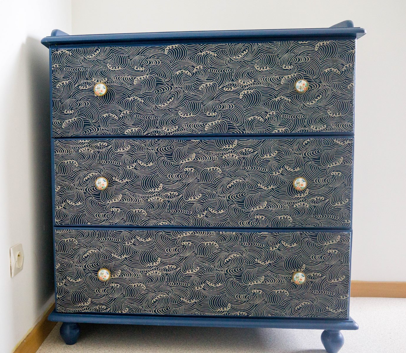 Commode en pin, je regrette de ne pas avoir de photo du avant. Elle était entière jaune ! Je l’ai décapé au décapeur thermique, j’ai plaqué les tiroirs pour faire disparaitre les moulures puis j’ai collé du tissu dessus, remplacé les poignées et peint le reste en bleu indigo. C’est ce qui donnera le point de départ de la décoration de la chambre !