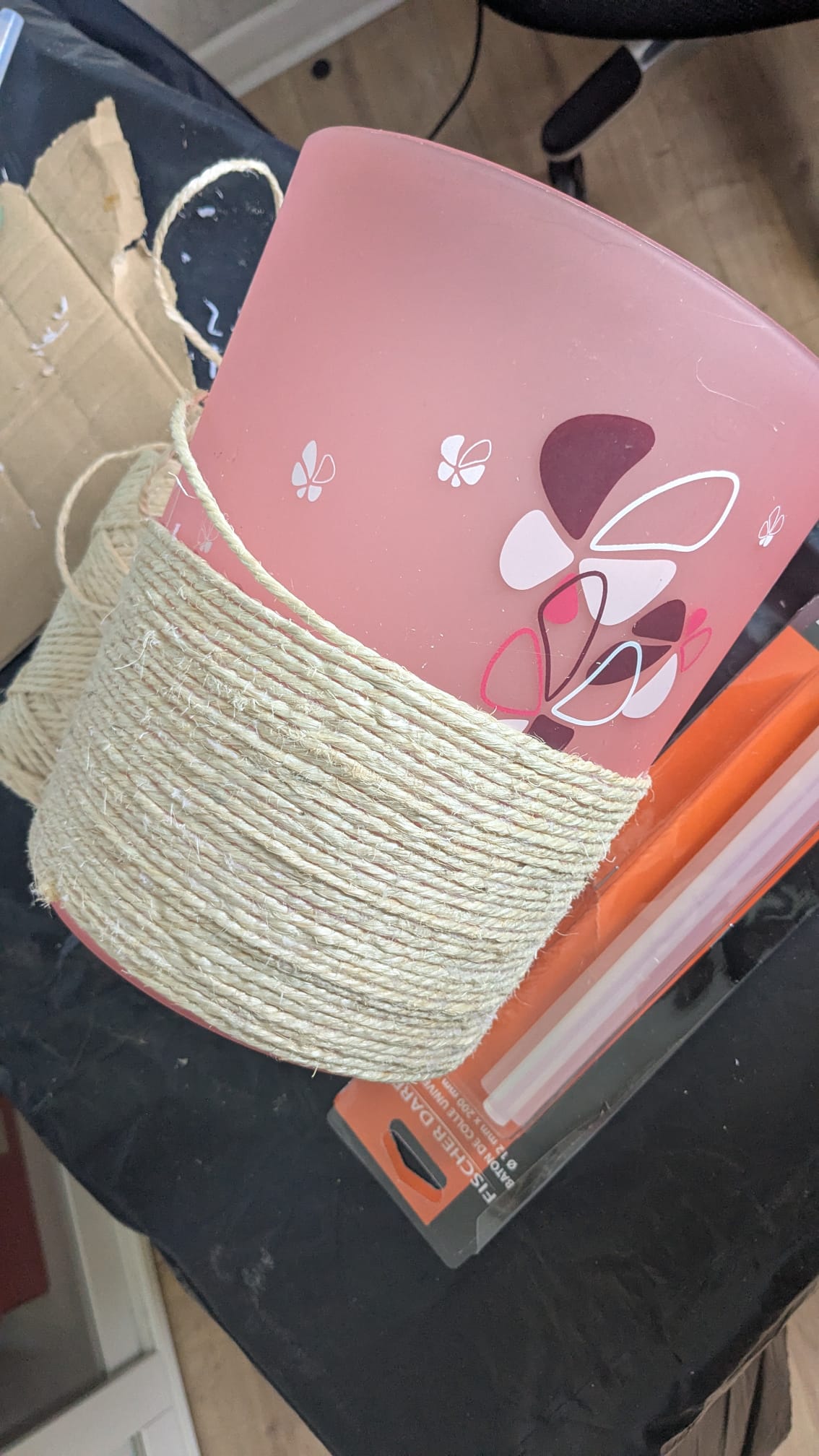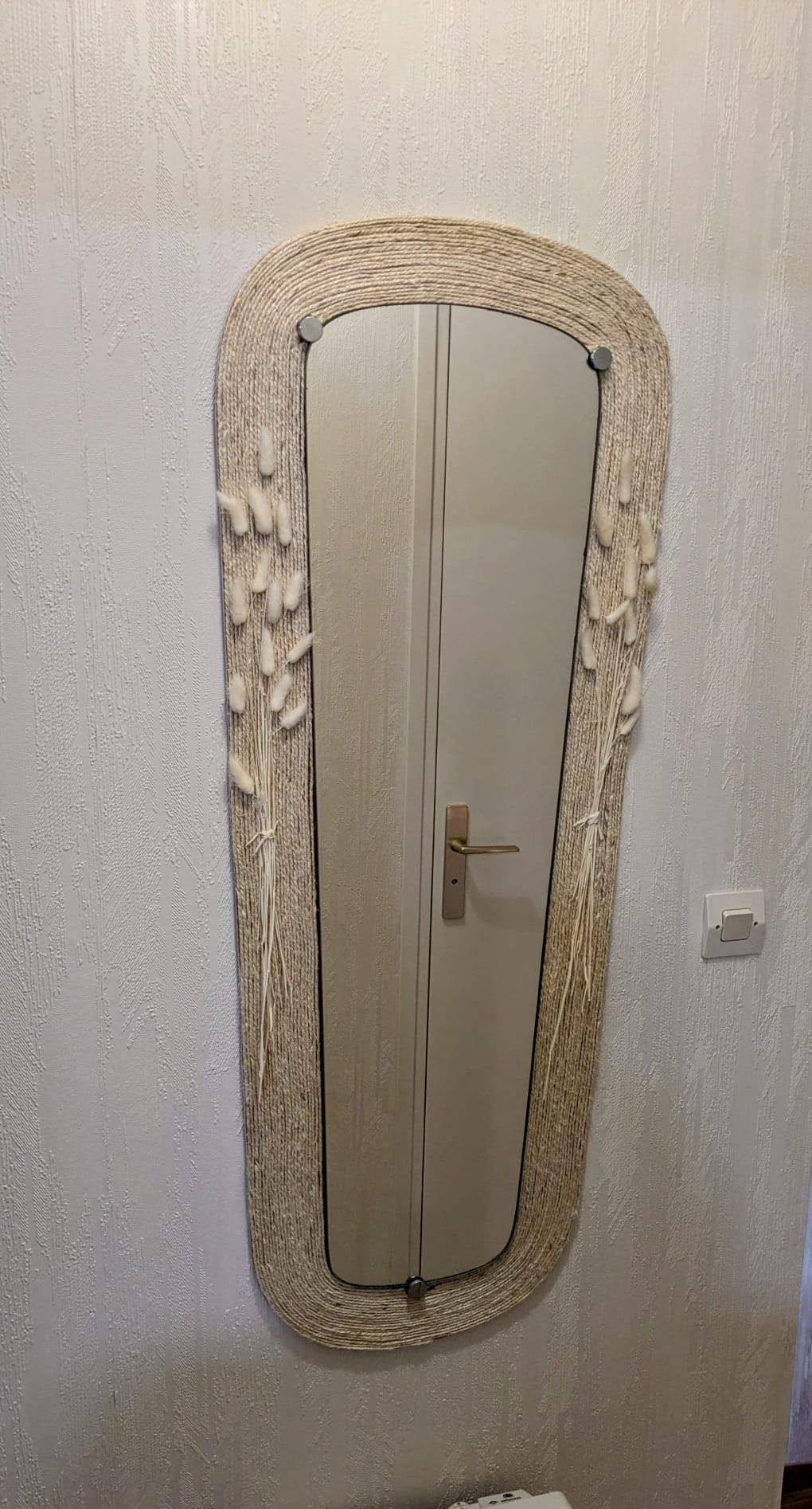 Un en corde, avec sa poubelle assortie. Le miroir a été fixé sur une fine planche. Puis j’ai fait le tour encore et encore et encore et encore en collant ma corde à la colle chaude. Pas très inspirée pour celui là mais la forme s’y prêtait et j’avais un rouleau de corde. Puis je me suis attaquée à la poubelle qui faisait un peu tache!